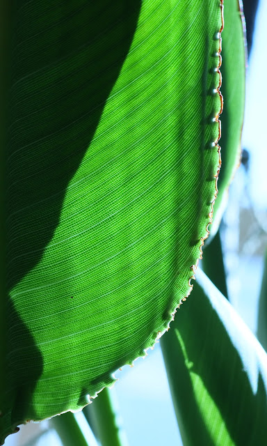 ストレチアに蕾らしい膨らみが出てきました?。葉の縁が綺麗なので撮りました🙆。